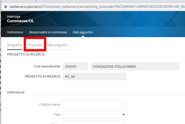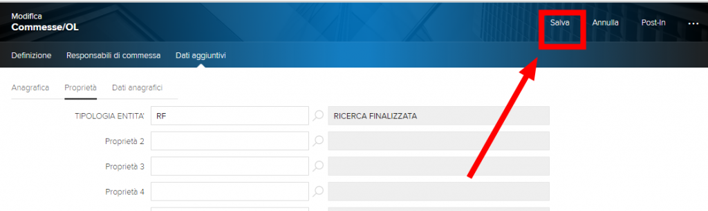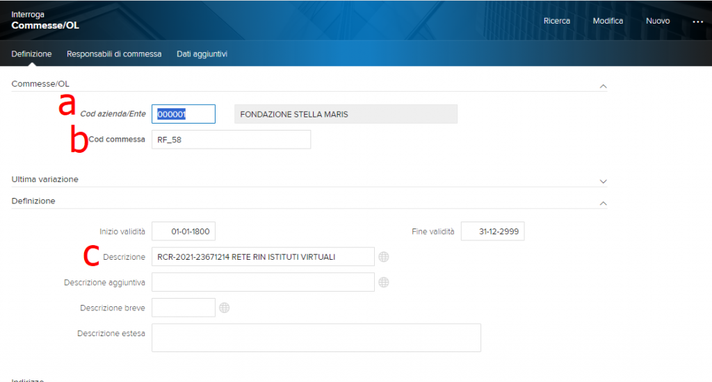 Inserire il codice progetto (nell’esempio caso RF_58 nel campo Cod commessa (b)