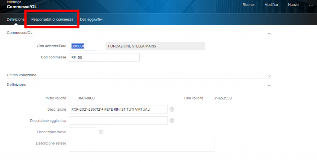 Procediamo facendo clic su “responsabile commessa” in alto