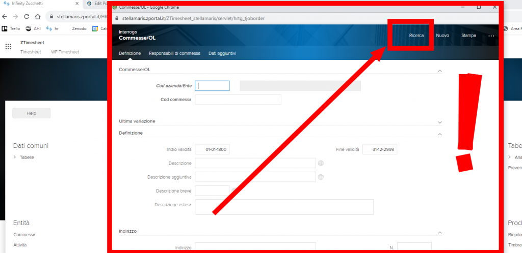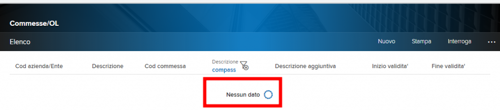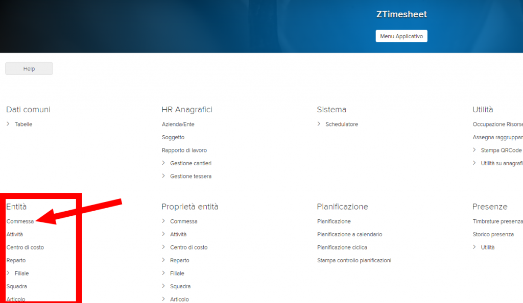 Se si dispone dei permessi necessari verranno mostrati molti link. Ci interessa il link “Commessa” nella sezione Entità