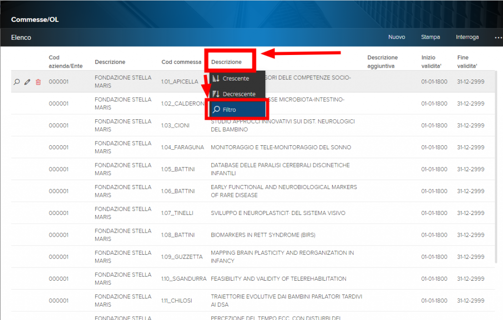 Ad esempio, se voglio cercare per titolo del progetto, posso fare clic sulla colonna “descrizione”, poi fare clic su “filtro”