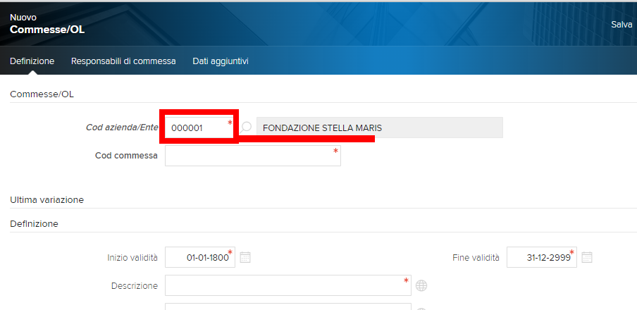 Si aprirà la maschera da compilare. iniziamo dal Codice azienda. Inserendo 1 comparirà nel campo a destra il testo “Fondazione Stella Maris”